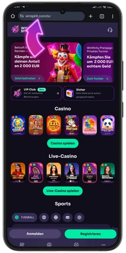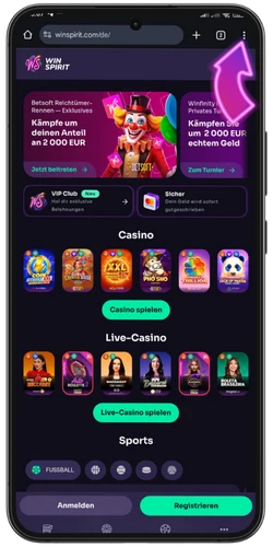 Die mobile Version bildet das komplette Desktop-Layout ab: dunkles Interface, violette und grüne Akzente, alle Bereiche direkt erreichbar. Über die WinSpirit casino app greifen Sie auf 6.500+ Titel, Sportwetten, Live-Dealer-Tische und den VIP-Club zu. Die Hauptnavigation gliedert sich in 7 Kategorien, die wir unten auflisten.